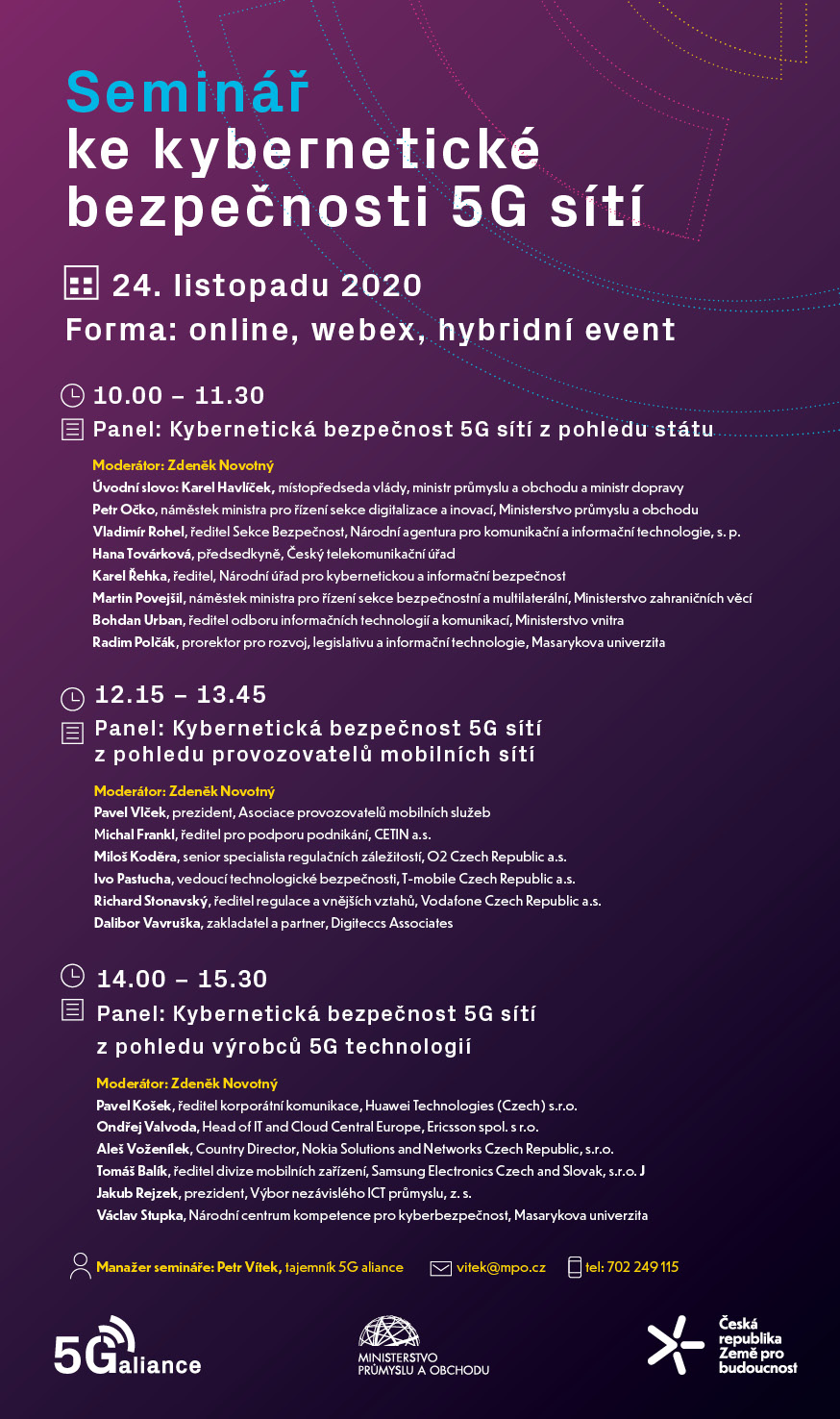 Seminář ke kybernetické bezpečnosti sítí 5G zahájil místopředseda vlády a ministr průmyslu a obchodu a ministr dopravy Karel Havlíček. Navázali na něj ředitel Národního úřadu pro kybernetickou a informační bezpečnost Karel Řehka, náměstek ministra zahraničních věcí Martin Povejšil, předsedkyně Českého telekomunikačního úřadu Hana Továrková, ředitel odboru informačních technologií a komunikací ministerstva vnitra Bohdan Urban či ředitel bezpečnosti státního podniku NAKIT Vladimír Rohel. Nechyběli ani zástupci akademické sféry, například prorektor Masarykovy univerzity v Brně Radim Polčák, i reprezentanti soukromého sektoru jak z řad operátorů, tak z technologických firem, které vyvíjejí a dodávají vybavení pro sítě nové generace. Akce se konala pod hlavičkou 5G Aliance, o které víc informací najdete na webu www.5Galiance.cz.