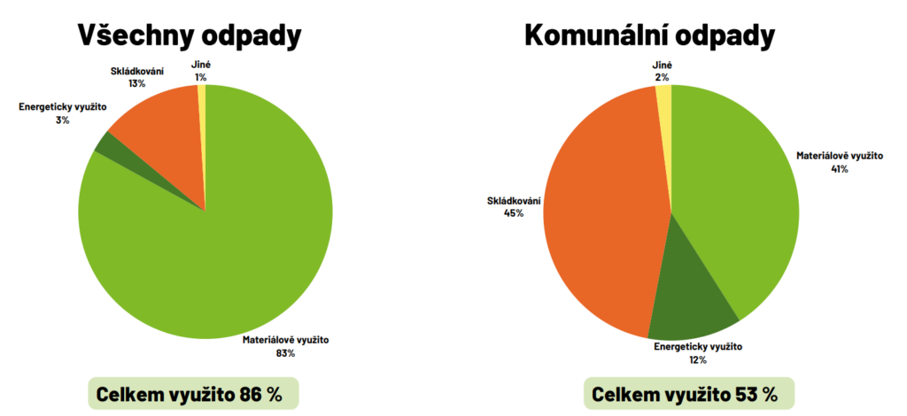 Na skládkách v roce 2022 skončilo 45 % komunálních odpadů (pro srovnání – průměr v EU je 23 %), meziročně došlo k poklesu množství komunálních odpadů ukládaných na skládku o 185,5 tisíc tun, což je příznivý výsledek a ukazuje, že se daří odklon od skládkování. V roce 2022 se podařilo vyseparovat z obcí 1,1 milionu tun surovin (papír, plasty, sklo, kovy).