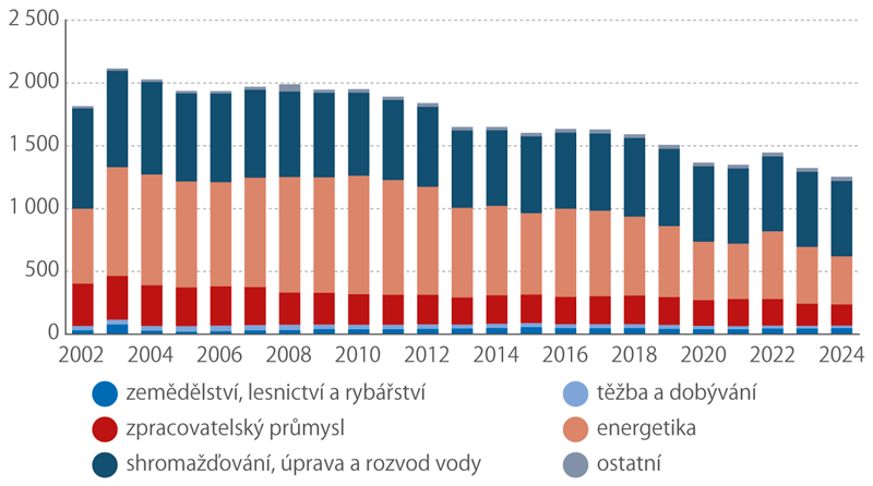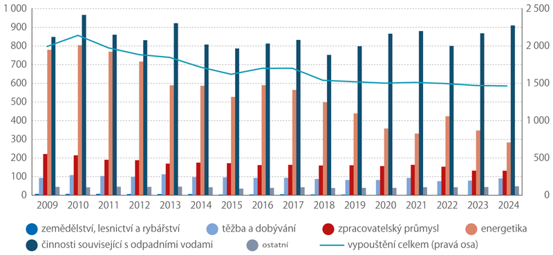 V roce 2024 bylo do vodních toků vypuštěno celkem 1 464,4 mil. m3 odpadních a důlních vod, což představuje meziroční snížení o přibližně 0,5 %. I v tomto případě, podobně jako u odběrů povrchových vod, se jedná o historicky nejnižší množství vypouštěných vod. Z dlouhodobého pohledu pokles vypouštěných vod částečně zrcadlí poklesy odběrů v energetice, částečně je způsoben zpřesněním systému vykazování vypouštění.